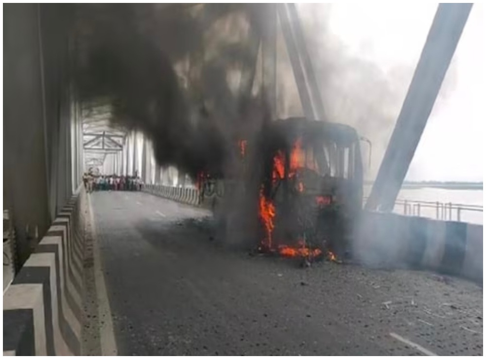 पटना आ रही बस में भीषण आग लगने से बस पूरी तरह जलकर राख हो गया